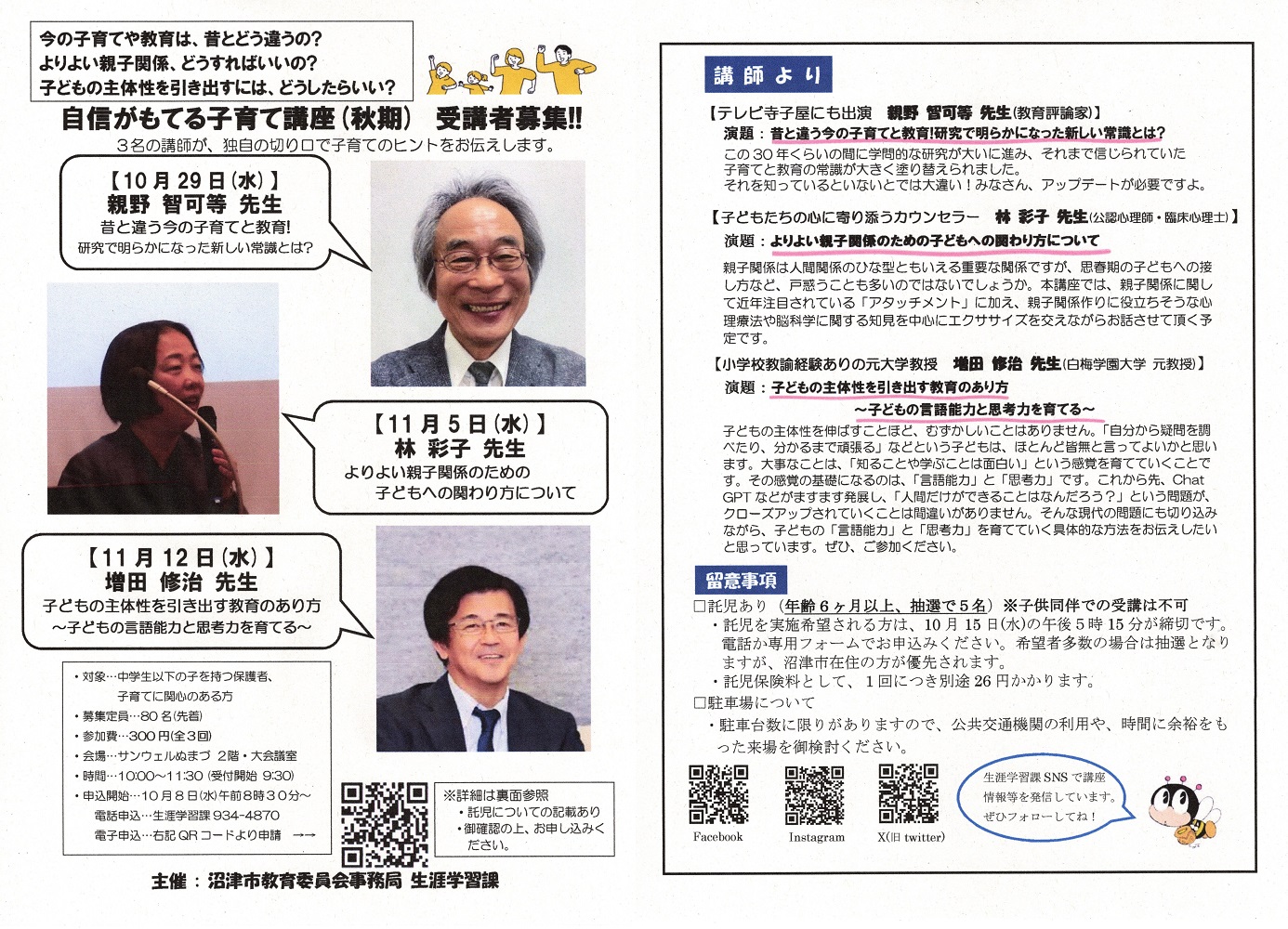 電話…沼津市生涯学習課 055-934-4870 インターネット(沼津市ホームページから)… http://www.city.numazu.shizuoka.jp/kurashi/kyoiku/kyoiku/shougai/kouza/katei_k.htm |