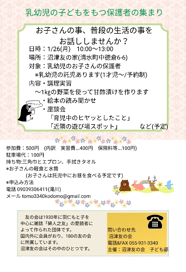 | 連絡先 | 沼津友の会 滝川 tomo3340kodomo@gmail.com 090-3930-6411 |